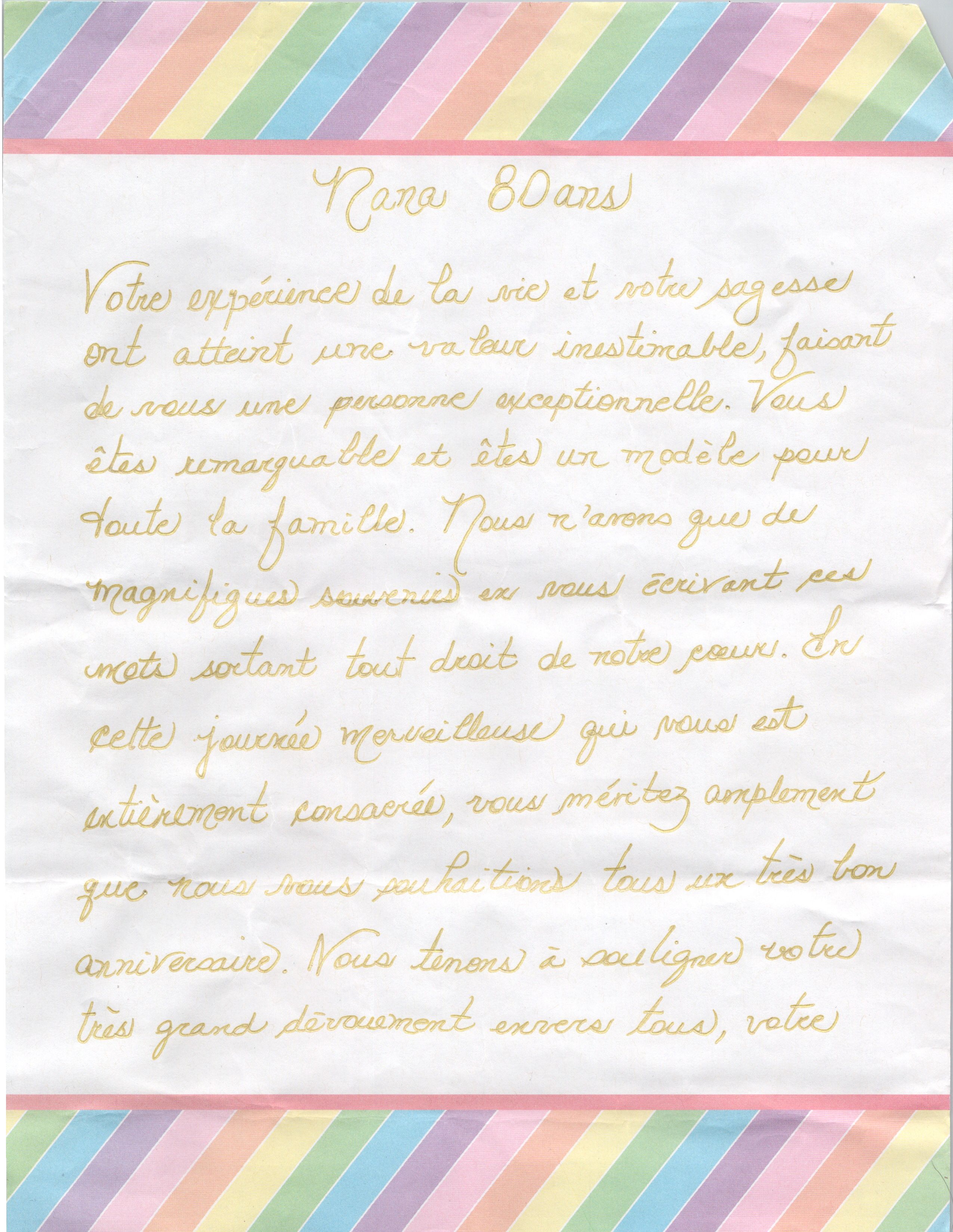 Un merci tout spécial à Pierrette qui a été d’une aide indescriptible et qui était une grande amie qu’elle chérissait dans son cœur. Tu seras dans nos cœur la continuation de Nana.